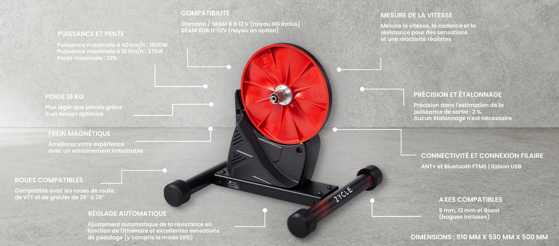 ZDrive MAX est le nouveau Wheel Off trainer de ZYCLE. Son design a été optimisé pour vous aider à tirer le meilleur parti de vos séances de cyclisme en salle et de tout type de vélo de route, de VTT et de gravel grâce à sa large compatibilité avec les roues de 26′ à 29′. Il offre également des performances de freinage améliorées, en particulier à faible cadence, pour simuler les conditions de montée les plus réalistes et avec des rapports de vitesse plus courts. Le ZDrive MAX favorise le travail à haute intensité grâce à sa puissance maximale de 1800W (à 40 km/h) et 375W (à 10 km/h). Si vous recherchez une expérience de pédalage fluide et naturelle, ce trainer à entraînement direct est fait pour vous. Il est facile à configurer, compatible avec les principaux simulateurs de vélo et applications de fitness, et offre une estimation super précise de la puissance de sortie grâce aux améliorations mises en œuvre pour rendre vos séances d’entraînement très efficaces.